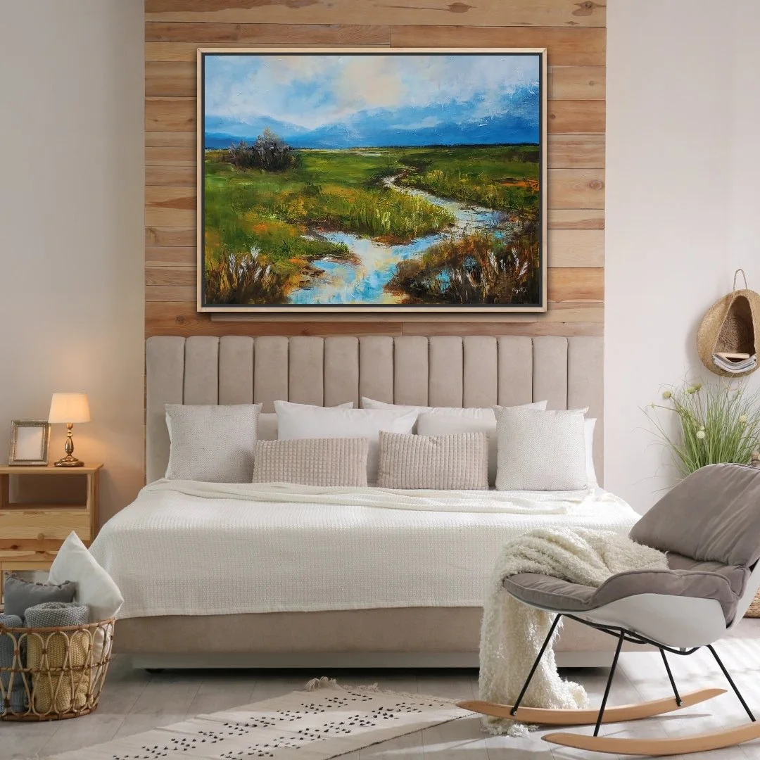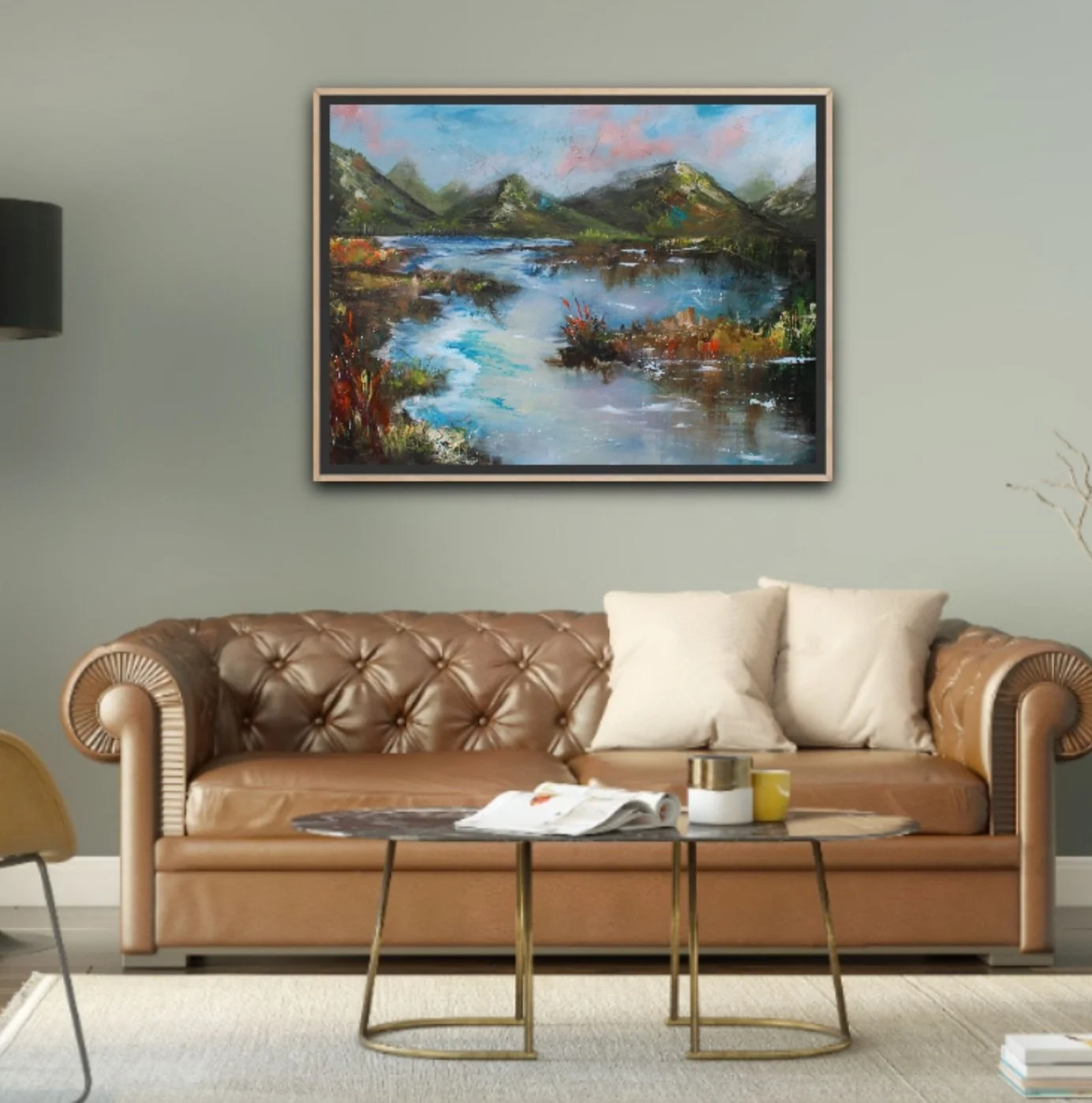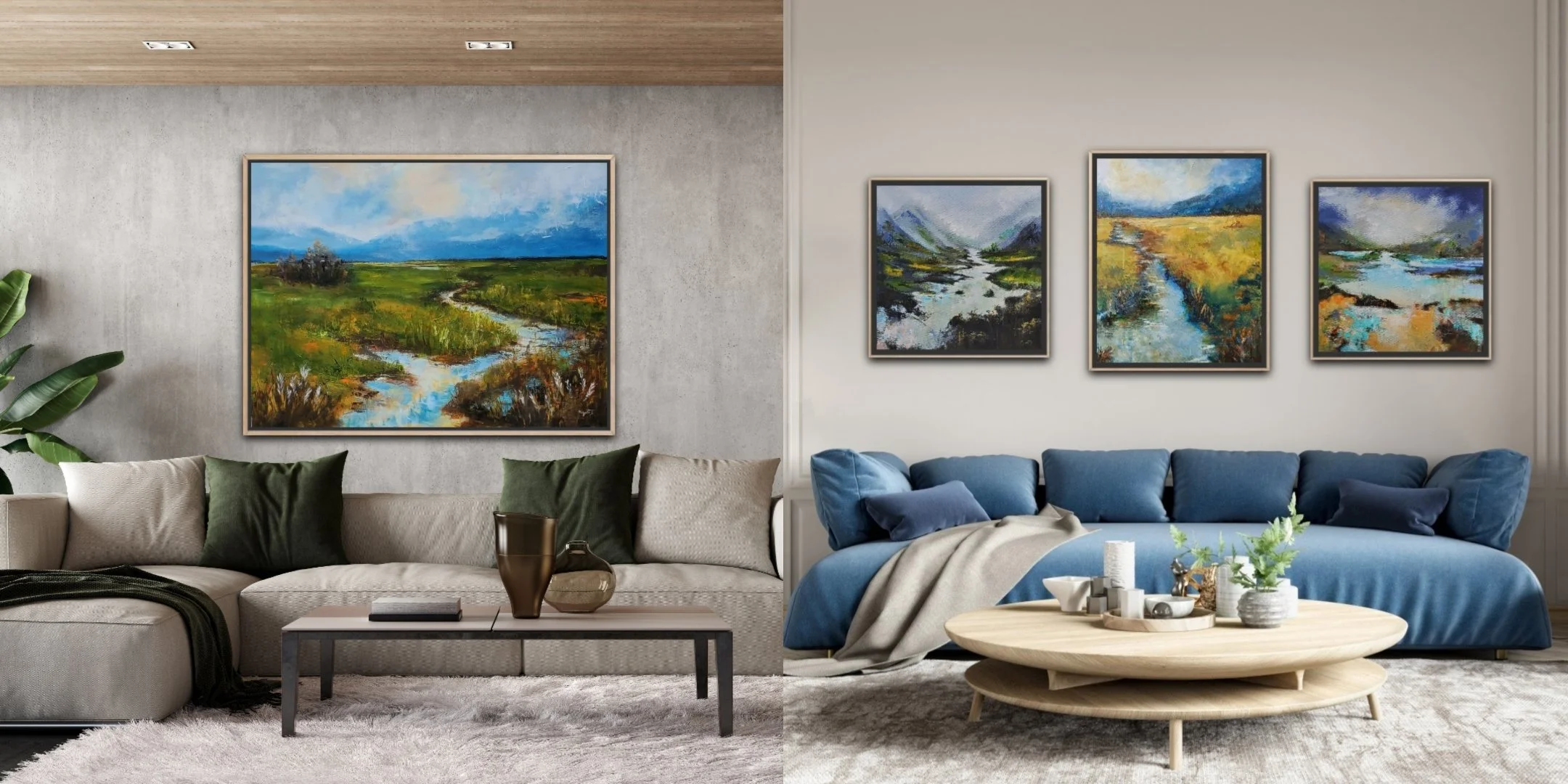 A Simple Guide to Styling Your Home with Calming Landscape Art. Muted clay background, soft hand-drawn leaves curling along the border. A gentle, warm tone that feels like stepping into a sunlit, slow morning.